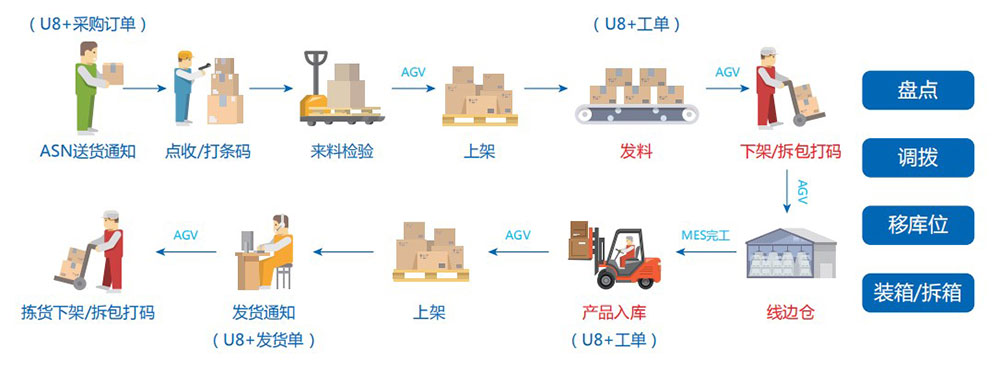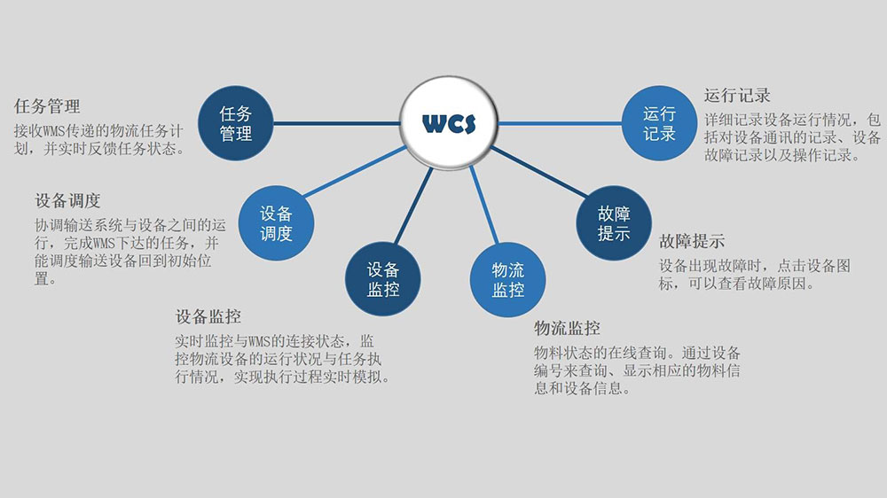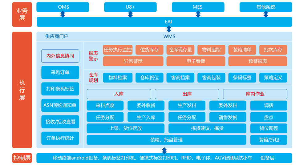 对接客栈管理系统(WMS),,,,,集成种种装备数据,,,,,监控和统一调理堆垛机、机械人、AGV系统等底层物流装备,,,,,高效执行妄想好的营业流程。。。。。。。。